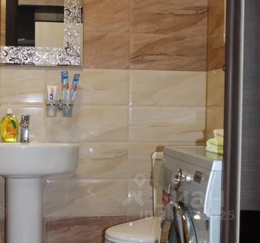 Санузел оснащен раковиной с тумбой, зеркалом со светильником, душевой кабиной, унитазом, полотенцесушителем, феном, корзиной для белья, настенной металлической складной сушилкой для белья.