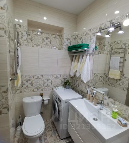 Санузел оборудован ванной, стиральной машиной, полотенцесушителем, раковиной, зеркалом, унитазом.