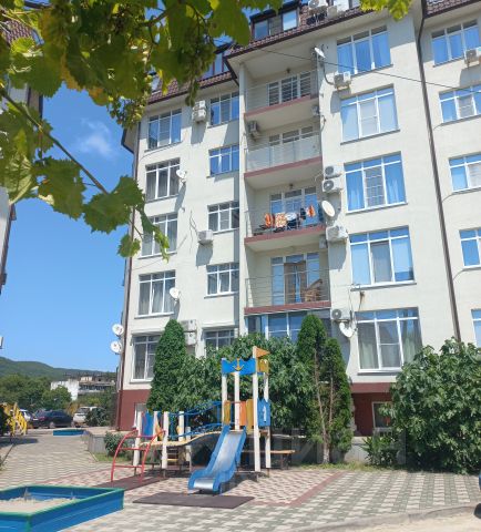 Сдаётся просторная евродвухкомнатная квартира в посёлке городского типа Новомихайловский по адресу Морская улица, д. 5/1. Кухня очень просторная и служит второй комнатой. Квартира расположена на первом этаже шестиэтажного дома. В квартире сделан евроремонт и установлена современная мебель как на кухне, так и в комнате. В квартире есть вся необходимая техника: кондиционер, холодильник, телевизор и стиральная машина. Дом ухоженный, с современным подъездом и пандусом для удобства. На территории имеется наземная парковка, въезд через шлагбаум, поэтому вы всегда найдёте место для своего автомобиля. Дом находится в тихом и спокойном районе, что создаёт атмосферу уюта и безопасности. Вся инфраструктура находится в шаговой доступности.