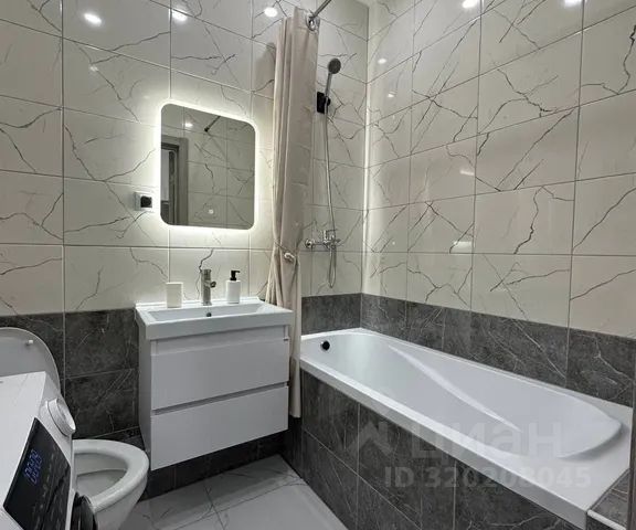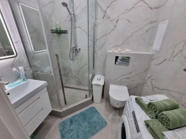 Санузел оснащен раковиной с тумбой, зеркалом со светильником, душевой кабиной, унитазом, полотенцесушителем, феном, корзиной для белья, настенной металлической складной сушилкой для белья.