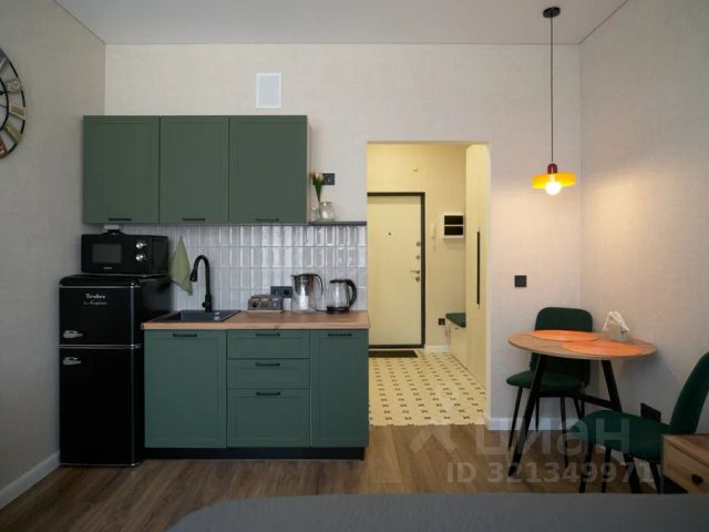 Кухонная зона имеет все необходимое: барная стойка, два полубарных стула, холодильник, стиральная машина indesit, микроволновая печь, чайник, газовая панель на 4 конфорки, вытяжка, столовые приборы и посуда.