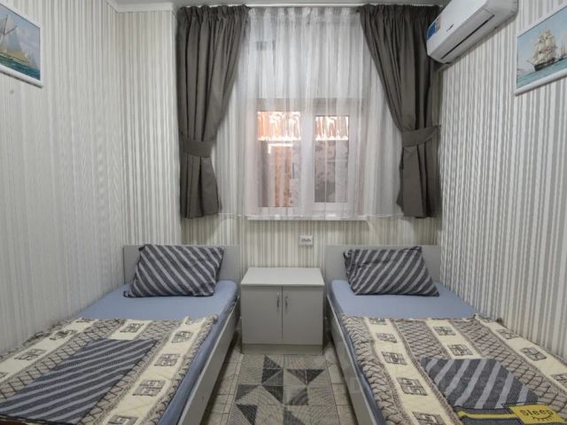 Номер/ апартамент люкс расположен на втором этаже второго корпуса. Имеет отдельный вход, полностью независим от других. Перед входом небольшой балкон, где можно выпить чашечку кофе утром. С него открывается вид на внутреннюю территорию и улицу. А так же, с балкона есть винтовая ажурная лестница, которая ведет в самое запоминающееся и потрясающее место крышу солярий. Отсюда открывается отличный вид на море. Есть шезлонги, небольшой столик, гамак. Днем здесь хорошо загорать, скрываясь от взглядов соседей. А ночью открывается просто завораживающий вид на черного глубокое бархатное южное небо, усыпанное звездами. Номер имеет окна на все четыре стороны. Это позволит вам реже использовать кондиционер, и наслаждаться морским воздухом, а не фреоном. В самом номере две изолированные спальни, просторная кухня-зал, санузел. В одной спальне большая кровать 160 см, тумбочки, шкаф, кондиционер. Вторая спальня две кровати, тумбочки, шкаф, кондиционер, телевизор. Кровати могут быть сдвинуты по желанию клиентов. Кухни полностью оснащены всей необходимой техникой и мелочами. Вам не надо ни о чем думать. Просто откройте ящик и возьмите все, что нужно. Из "базовой" техники установлены: холодильник, стиральная машина, СВЧ, мультиварка. По запросу предоставим пароварку, хлебопечь, миксер, блендер, мясорубку и прочее. На кухне есть большой диван, спальное место 160 см.