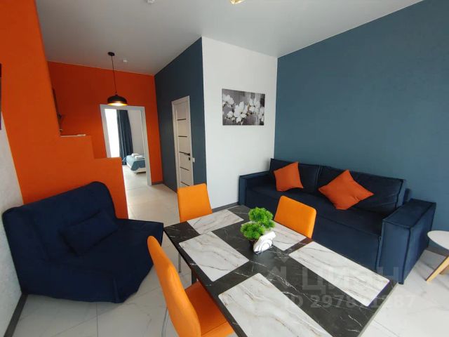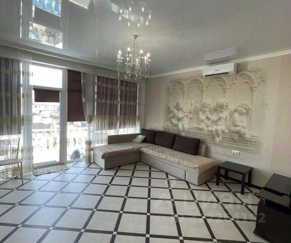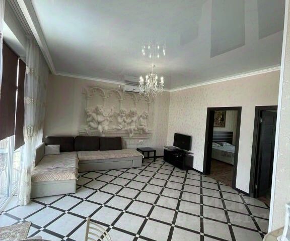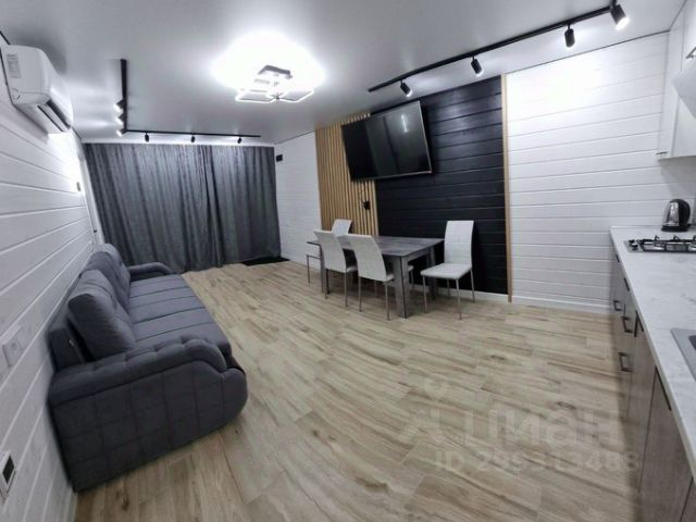 Двухкомнатный номер-студия. В гостинной раскладной двухспальный диван, кухня с набором посуды, холодильником, электроплитой, чайником, микроволновой печью. Также обеденный стол и стулья, ТВ.