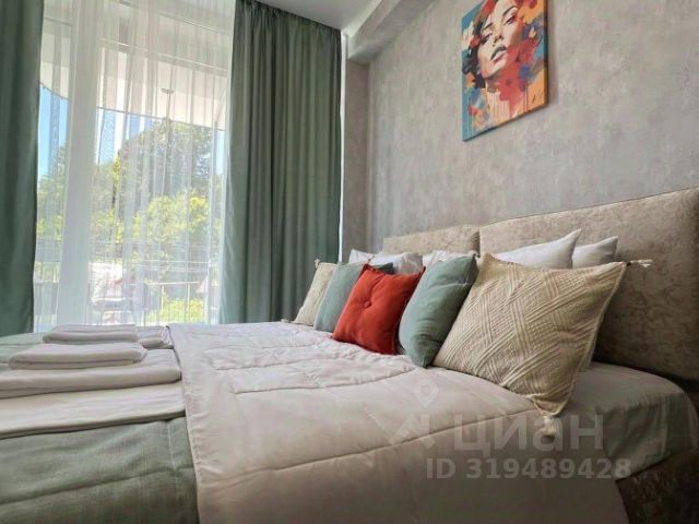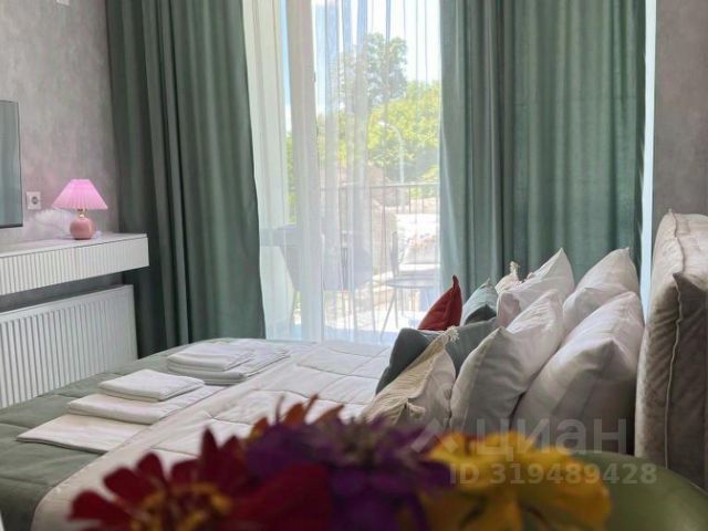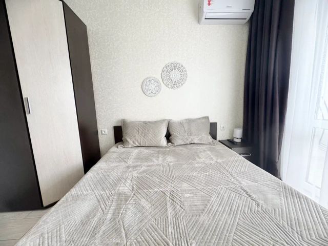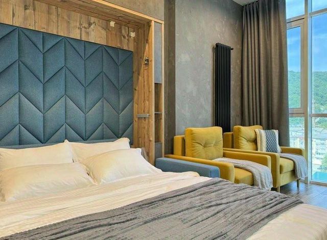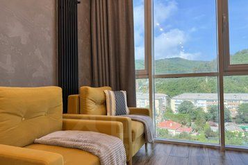 Однокомнатные апартаменты находятся на десятом этаже жилого десятиэтажного дома на первой линии курорта в 30м. от моря. Площадь апартамента 55 м². В апартаментах 2 панорамных балкона с видом на МОРЕ, реку, горы, и Ольгинку. Большая спальная комната, отдельная кухня, раздельный сан.узел. По всему апартаменту половое покрытие керамическая плитка.