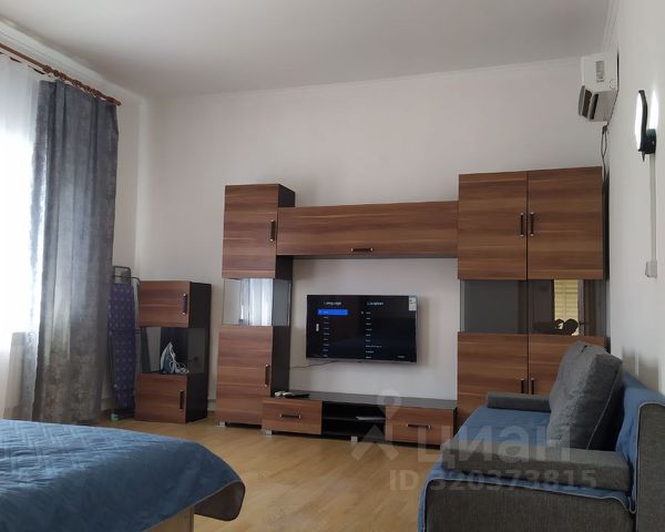 Комната-холл с выходом на террасу, в комнате телевизор, диван, кондиционер и 3 отдельные комнаты-студии: