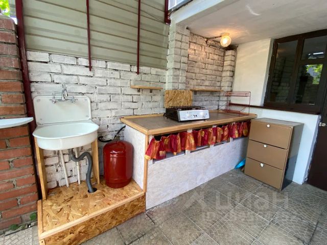 где стол со стульями , тахта, газовая печь, двойная раковина мойка, уличная мойка для ног и кран для воды.