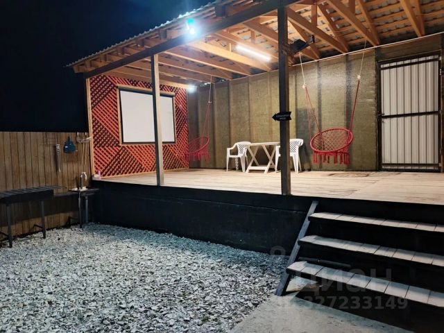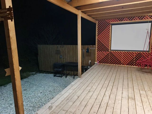 — терраса с садовой мебелью, подвесными качелями и уличным кинотеатром;