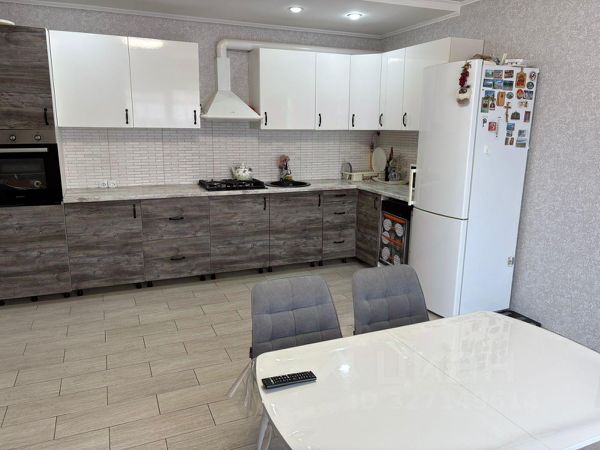 *Столовая-гостинная с кухонной мебелью, газовая плита и печь, микроволновая печь, посуда, холодильник, стол и стулья, вид на внутренний двор.