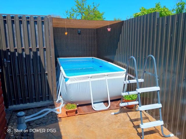 На участке один огороженный забором домик, подсыпан околом, каркасный бассейн с фонтаном подсветкой 4*2*122, пальмы небольшие, свет на участке , шезлонги