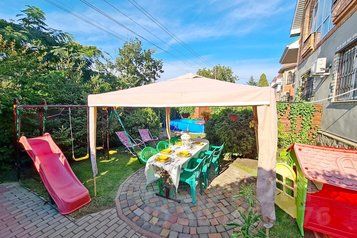 - Свой двор: розарий, зелёный газон, виноград, клумбы, беседка, для отдыха, садовая мебель, шезлонги, мангал, шампура, барбекю, коптильня;