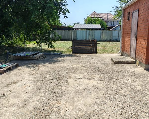Задний двор : крытая терраса, сад гранатовые плодоносящие деревья.