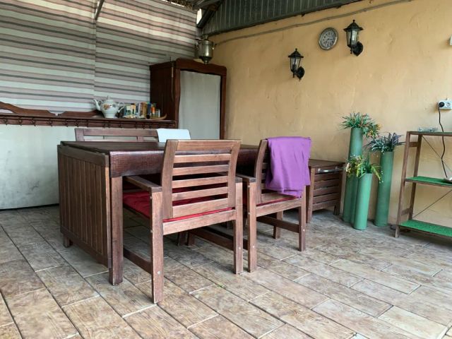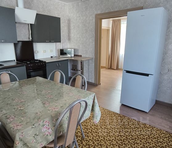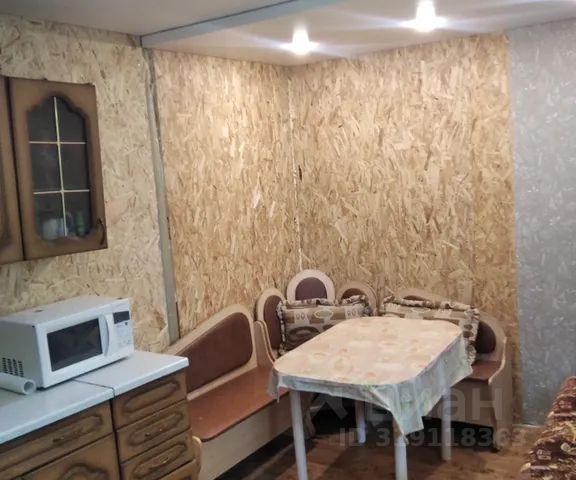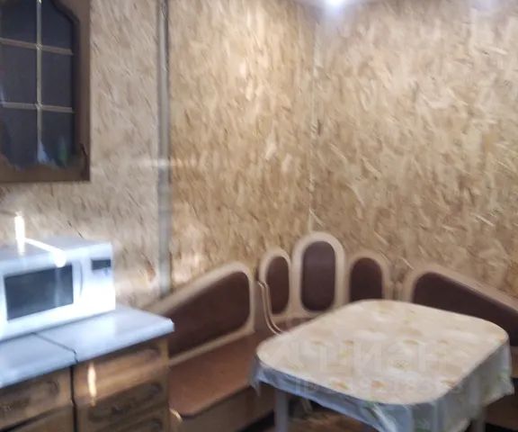 *Столовая-гостинная с кухонной мебелью, газовая плита и печь, микроволновая печь, посуда, холодильник, стол и стулья, вид на внутренний двор.