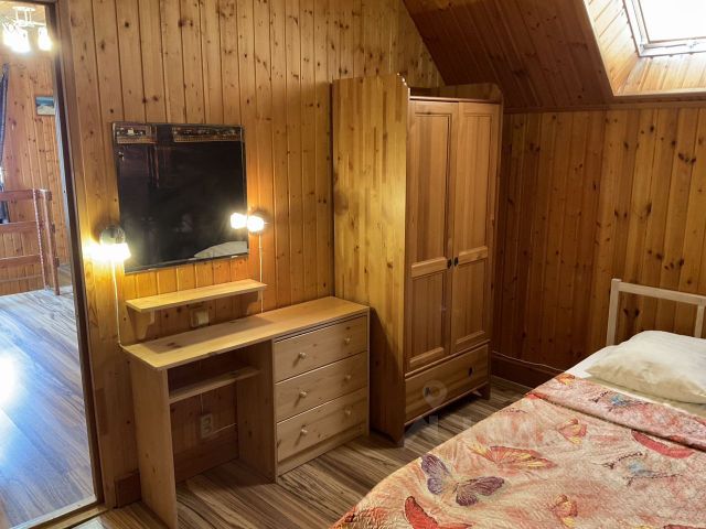 В большой комнате двухспальная кровать, два дивана двухспальных, шкаф пенал, тумба, телевизор, вешалка для одежды