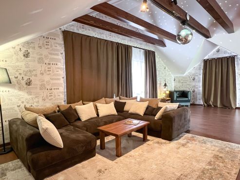 Большая русская баня на дровах (отделка липа) на 8-10 чел, до 100 градусов, с бассейном 2 x 3м тёплым, кадушка, веники (берёза, дуб, эвкалипт) с выходом в большой бассейн. Бильярдный зал со столом 10ft русский билиард - оплата отдельно 8000р/сут.