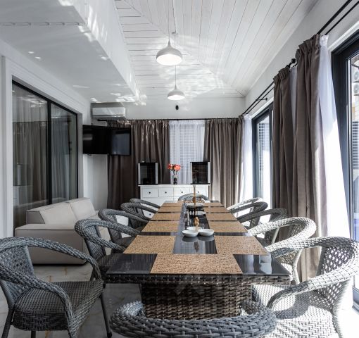 Беседка-шатёр у бассейна охлаждается туманом с большим столом на 35 чел - можем оформить и сервировать для Вас как на фото. Или + стол на 10-12 чел.