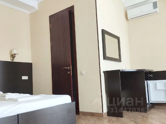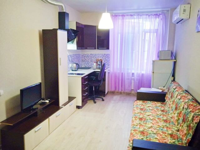 Студия оборудована кухней с индукционной электрической плитой, холодильником и чайником, есть необходимые столовые приборы, сковорода и кастрюля. Кондиционер охлаждает воздух, работает в режиме вентилятора. Совмещённый санузел с душем, туалетом и раковиной с зеркалом. Есть телевизор, обеденный стол и wi-fi. На окне и двери есть маскитная сетка от мух и комаров.