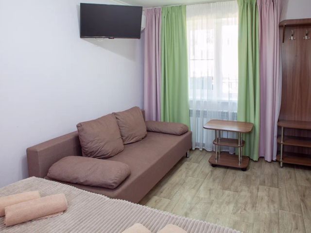 Уютный номер для незабываемого отдыха, как семьей так и веселой компанией. В номере имеется: кухня-прихожая оснащена обеденным столом, большим холодильником, микроволновкой, мультиваркой, электрочайником, всей необходимой посудой (тарелки разного диаметра, кружки, стаканы, рюмки, вилки, ложки и всевозможные миски); совмещенный санузел - душ, раковина, унитаз, сушилка для белья, водогрейка (холодная и горячая вода круглосуточно); спальная комната - две полуторные кровати по 1,2м. и один двуспальный диван (спальные места от 4х до 6и человек), тумбочки, вместительный шкаф, постельное белье, комплект полотенец для каждого гостя, покрывало для пляжа, WI-FI, сплит-система, жк телевизор. Бесплатные парковочные места рядом с номером. Своя мангальная зона. На территории есть детская площадка, отличная столовая и бар-шашлычная с бильярдом. Обустроенные пляжи