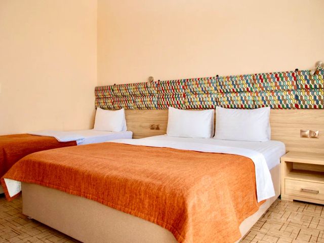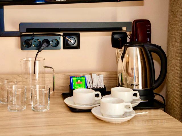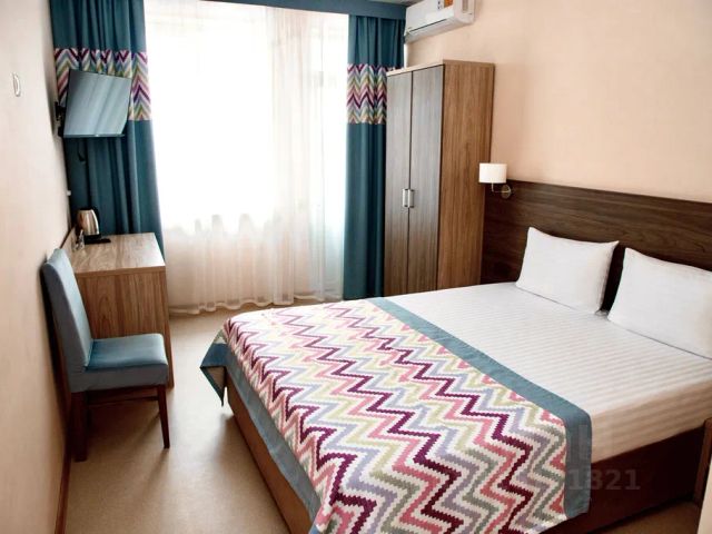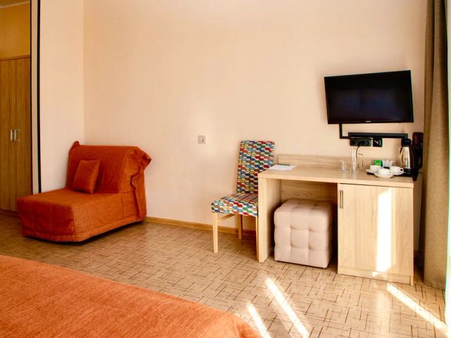 Номер укомплектован двуспальной кроватью, двумя прикроватными тумбами, шкафом для одежды, рабочим местом. Номер оснащен индивидуальной системой кондиционирования, телевизором, холодильником, бесплатным Wi-Fi, чайником. Ванная комната оснащена душевой кабиной и укомплектована набором полотенец, феном.