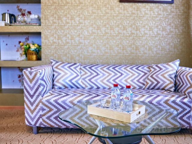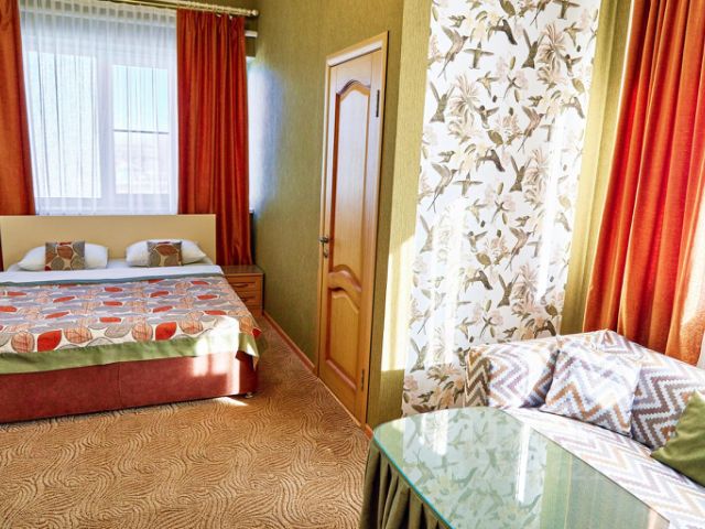Двухкомнатный номер с собственным санузлом, кроватью системы трансформер (TWIN/ DBL) и софой. К услугам гостей: ТВ, мини-холодильник, СПЛИТ-система, Wi-Fi, чайник, чашки, чай и кофе, питьевая вода., фен, гигиенические средства, косметические средства, полотенца.Совмещенный санузел с душевой кабинкой, фен, гигиенические средства, косметические средства, полотенца.