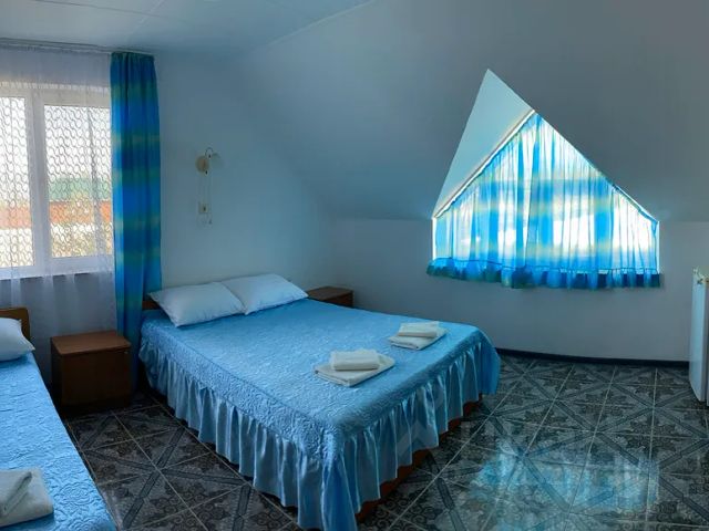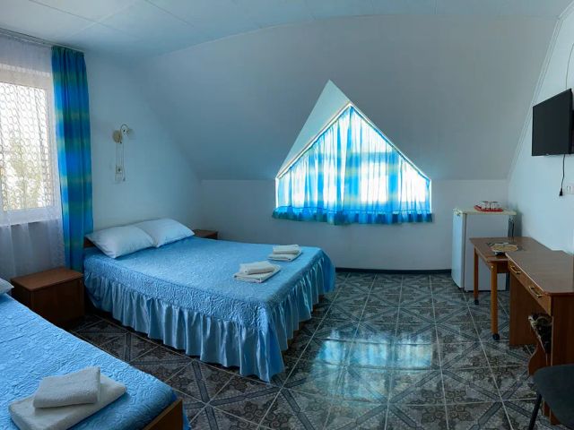 Гостинично-спортивный комплекс в 3 минутах ходьбы от пляжа в поселке Волна. На расстоянии 4 км располагается порт Тамань. В 2 минутах ходьбы от отеля автобусная остановка "Волна". Расстояние до ж/д станции "Тамань-Пассажирская" 7 км, до аэропорта Анапы 86 км. Для бронирования доступны номера категорий Стандарт и Люкс. Каждый из них оснащен телевизором, телефоном, холодильником, рабочим местом, феном. Собственные ванные комнаты оборудованы душевой кабиной. На всей территории доступен Wi-Fi. В ресторане при отеле организовано питание по системе "шведский стол". В комплексе есть множество различных спортивных залов, танцевальные площадки для проведения мероприятий. Гости могут поиграть в бильярд, посетить сауну и хаммам, а также отдохнуть на шезлонгах у открытого бассейна. Отель имеет собственный пляж. Для деловых мероприятий оборудован конференц-зал. Личный автомобиль можно оставить на парковке. Уютный трехместный номер с одной двуспальной и одной односпальной кроватью. Здесь будет уютно небольшой семье.