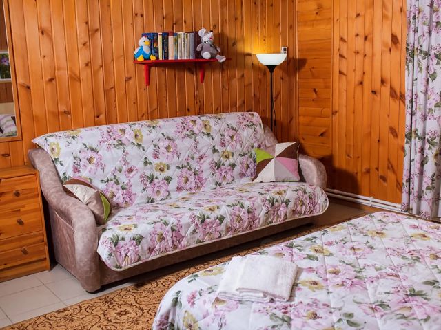 Уютная комната для большой семьи со всеми удобствами, ванной, балконом. Во дворе летняя кухня с мангалом и столиками, бассейн с шезлонгами, парковка, детский уголок, столовая. Возможно проведение праздников и вечеринок, организация экскурсий, завтраков по заявке.