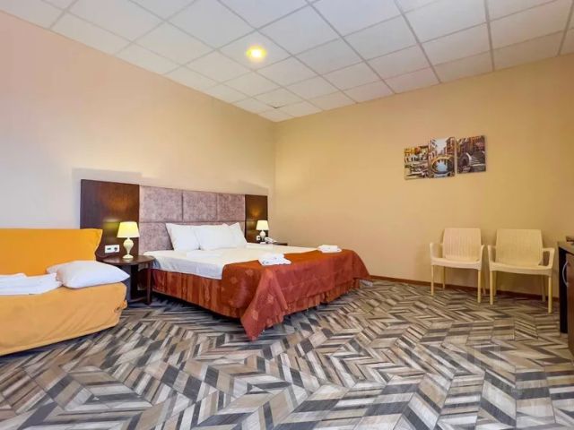 Гостевой дом "Добрый Бобр" - располагается в поселке Ильич Темрюкского района на второй береговой линии, в 410 м от центрального пляжа. На территории имеется открытый бассейн (бесплатно, только для наших гостей), автостоянка (бесплатно, только для наших гостей), детская игровая площадка, игровая комната с бильярдом и настольным теннисом (бесплатно), библиотека (бесплатно), мангальная зона с беседками (платно) и большой фруктовый сад. Трансфер предоставляется по запросу и оплачивается отдельно. Просторные семейные номера предоставляют размещение на двуспальных и односпальных кроватях и удобных диванах. В комнатах есть кондиционер и телевизор, шкаф и вешалки для одежды, холодильник , постельное белье и полотенца, вай фай, вся необходимая мебель. В ванной комнате есть душ, раковина, унитаз, зеркало. Кресла со столиком на балконе у каждого номера. В летний период проводятся мастер классы для детей и взрослых. Имеются удобства для людей с ограниченными возможностями на первом этаже. Доступен выход в интернет. Доступно проживание с животными мелких и средних пород (по предварительной договорённости, платно). Питание гостей организованно в кафе- столовой (часы работы 8.00-20.00), где можно попробовать разнообразные блюда по меню без предварительного заказа. На третьем этаже с 19.00 до 23.00 функционирует открытое кафе с видом на Крым, Азовское и Черное моря. В пешей доступности находятся общественные пляжи, магазины и кафе. Ближайшая ж/д станция - в 60 км в Тамани. до ближайшего аэропорта и жд вокзала г.Анапы 80 км, в г. Керчь составит 111 км, до аэропорта Геленджик - 163 км, до жд вокзала Славянска на Кубани 120 км, до автовокзала Темрюка 60 км. Номер Полулюкс для удобного размещения семьи из двух-трёх человек. Оборудован двуспальной кроватью, односпальной кроватью и необходимой мебелью. Укомплектован холодильником, телевизором и сплит-системой. Имеет собственный сан. узел. На балконе номера оборудовано место отдыха с плетеной мебелью и столом. при необходимости может быть дополнительно установлена детская кровать-манеж.