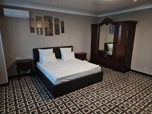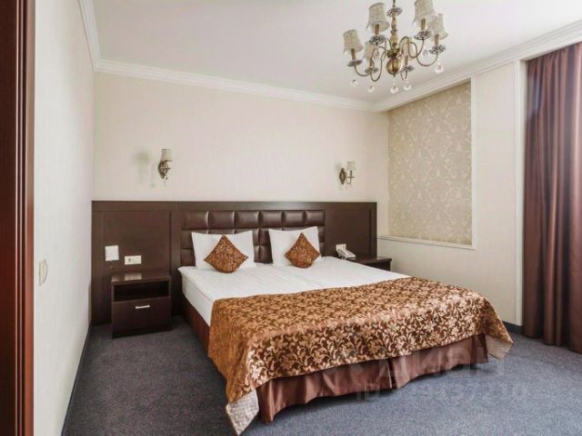 Система климат-контроля, удобный шкаф-купе, большое зеркало, двуспальная кровать с ортопедическим матрасом, гипоаллергенные постельные принадлежности, прикроватные тумбочки, мягкий стул, стол, большой ЖК-телевизор, телефон, просторная душевая кабина, санузел, фен, косметические принадлежности (зубная щетка и паста, гель для душа, шампунь, мыло), комплект посуды.
