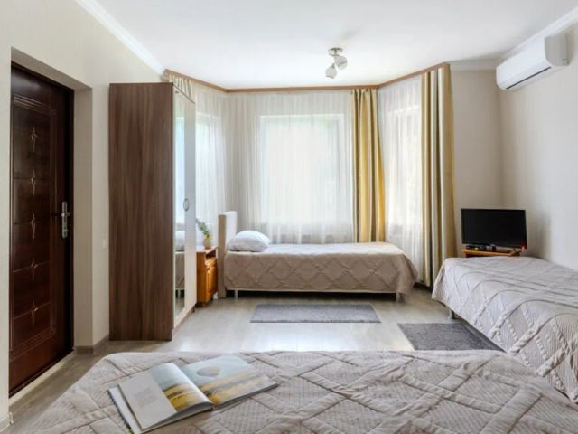 Гостевой дом в центре хутора Гуамка в Апшеронском районе Краснодарского края. Всего в 5 минутах ходьбы располагается знаменитое Гуамское ущелье. На расстоянии 500 м протекает река Курджипс. До автобусной остановки "Веселая улица" 4 минуты ходьбы. Расстояние до ж/д станции "Гуамское ущелье" 800 м. Для бронирования доступны комнаты различных категорий: Эконом, Стандарт, Улучшенный, Комфорт, Люкс. Гости также могут расположиться в отдельных коттеджах. Все комнаты оборудованы телевизором, холодильником, кондиционером, собственной ванной комнатой. Коттеджи представляют собой домик-студию или двухэтажный дом. Каждый из них оборудован кухонным уголком. В кафе подают блюда русской и европейской кухни. На территории обустроена мангальная зона, где можно пожарить шашлыки. Гости также могут посетить сауну. Для личного транспорта предусмотрена парковка. Трехместный номер полностью отделан деревом, прекрасно подходит для семейного отдыха, либо для компании 3-х человек. В номере 1 двуспальная и 1 односпальная кровати, коврик, комплект полотенец, плазменный телевизор c цифровым ТВ, санузел (туалет, душ), туалетные принадлежности, фен, холодильник, Wi-Fi, сплит-система.