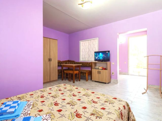 Для Гостей нашего гостевого дома предоставлены комфортные номера с современным ремонтом в одноэтажных кирпичных корпусах, где вы будете обеспечены спокойному проживанию: никто не будет мешать шумом сверху! Удачное расположение корпусов не создает на территории скопления Гостей! Двухкомнатный 4-х местный номер состоит из 2-х раздельных комнат, со всеми удобствами: душевая, унитаз, кондиционер, холодильник, телевизор ЖК, столик со стульями, комод, шкаф плательный двустворчатый, кровати : одна двуспальная и две односпальные, буфет с посудой, эл. чайник. В номерах и на территории имеется Wi-Fi. У каждого номера своя отдельная веранда, покрытая зеленью, где в утренние часы, под пение птиц, на свежем воздухе можно выпить чашечку кофе. Для детей имеется небольшая игровая площадка, где имеются: качели, качалки, турник, гамак, батут, детский бассейн. Для вашего семейного отдыха с маленькими детьми соблюдаем дневной час отдыха и в вечернее время после 22 часов. Территория просторная, имеются уголки отдыха, виноградные беседки, лавочки, имеются две просторные кухни самоприготовления, со всеми принадлежностями, микроволновая печь СВЧ. Предоставляем в бесплатное пользование камин-барбекю, гладильная, утюг. На территории имеется свое кафе "Астери", где вы можете отдохнуть и сделать заказ. Имеется парковка на 5-6 машин на площадке у двора, под видеонаблюдением. Гостевой дом расположен в 5-ти минутах от центра и в 7-ми минутах от моря. Улица тупиковая, поэтому нет шума от проезжающих машин. Обеспечена встреча и проводы от ж/д вокзала и аэропорта до гостиницы. На территории двора имеется глубинная скважина, что обеспечивается бесперебойное водоснабжение горячей и холодной водой! С животными не принимаем!