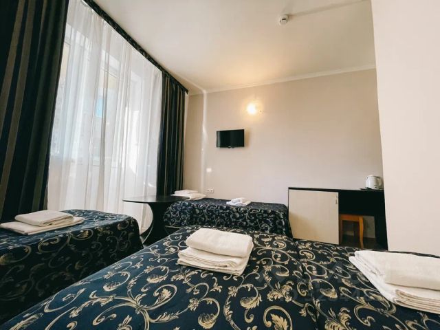 Размещение: 3 человека + дополнительное место Площадь: 30 кв. м. В номере: Одна двуспальная кровать и одна односпальная Бесплатный Wi-Fi Сплит система Телевизор с плоским экраном Зеркало Шкаф/гардероб Трельяж Прикроватные тумбочки Электрический чайник Комплект полотенец Туалетные принадлежности Холодильник Балкон Санузел (ванна, туалет, фен)