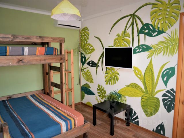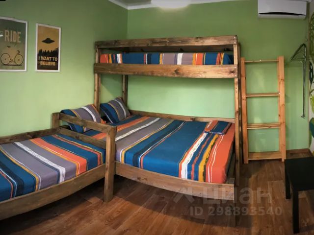 Номер 2 "Green" комфорт, второй этаж. 3х местный номер, оформлен в светло зеленом стиле. В номере две кровати из массива сосны, одна большая двухместная, другая односпальная. Для организации вещей в номере установлен деревянный шкаф, вешало и журнальный столик. Шкаф и столик оформлены в оригинальном стиле. Из техники в номере имеются: телевизор и кондиционер. При выходе из номера находится большая терраса-балкон, где расположен столик, стулья и диван. Кухня и санузел общие, на 4 номера. На кухне два больших холодильника, печка газовая, микроволновка, чайник и вся необходимая посуда. Во дворе песочница, настольный теннис, дартс, книжный стеллаж с комиксами и классической литературой. Качели, ротанговый кокон, большая зона отдыха. Wi-Fi, принадлежности для барбекю (решетка и шампура). Бесплатная парковка по предварительному бронированию.
