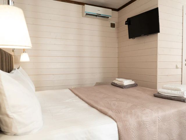 Выбор путешественников предпочитающих в любых обстоятельствах жить с удобствами. Двуспальная кровать, шкаф и прямой выход на собственную террасу, где можно почитать книгу или насладится обедом. Удобства в номере: - Уютная терраса - Совмещенный санузел - Хранение: вешалка для одежды, комод - Техника: кондиционер, холодильник, чайник, телевизор - Приборы: кружка и стакан на каждого гостя - Прикроватный столик - Полотенца (3шт. в комплекте) на каждого гостя