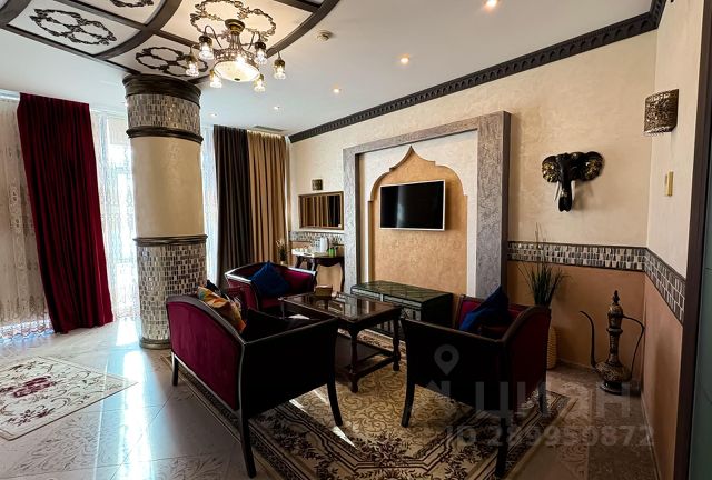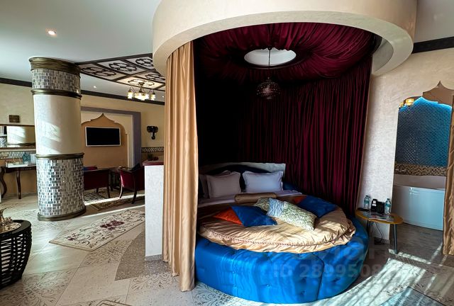 Номер "Марракеш" — это роскошь, и простота, причудливость форм и узоров, таинственный шарм этнических деталей, пряный аромат благовоний, чарующие мотивы колониальных стран, национальная роспись, мерцание свечи, сквозь цветное стекло, цветная мозаика и золото...Фаворитом стиля "Марракеш", в городской среде, является сказочная, чарующая, коллекция интерьерных подушек и элементы декора напоминающие о тепле и чудесах африканских стран. Палитра номера - это смелое сочетание красных, желтых, терракотовых оттенков с темными глубокими тонами синего, фиолетового, черного, а так же пестрое смешение богатых узоров персидских ковров, атласных подушек и ярких занавесей.. Основными компонентами дизайна выступают многочисленные арочные двери, обрамленные символической резьбой; стенные ниши с фонтаном, низкие столики, сундуки, тахты, прочно посаженные на могучих изогнутых ножках и покрытые богатым бархатом из покоев султ