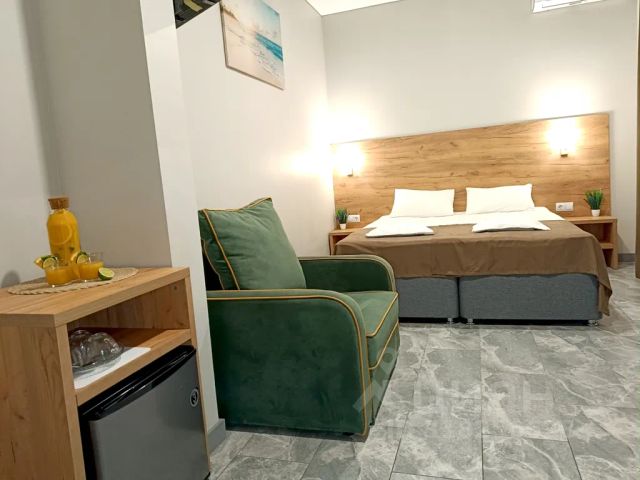 Трёхместный номер люкс без кухни. В номере: двуспальная кровать, раскладной диван-кровать, шкаф, тумбочки, кондиционер, телевизор, холодильник, эл. Чайник, санузел, туалетные принадлежности и полотенца.