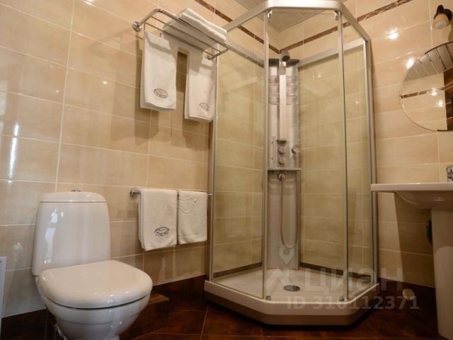 Комната с душевой комнатой, санузлом, телевизором с тонким экраном.