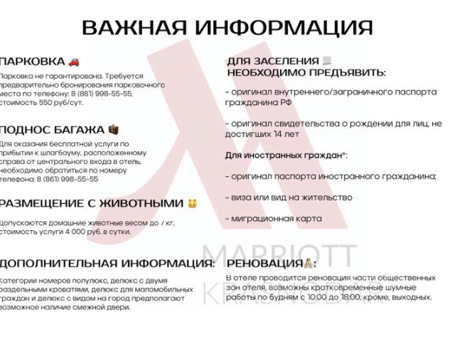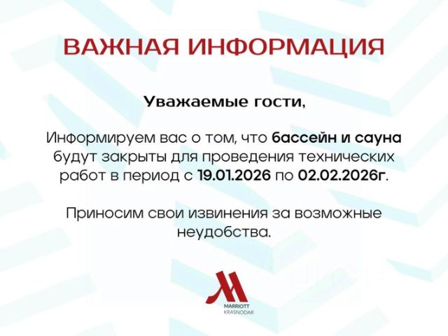 Пятизвёздочный отель, представленный флагманским брендом компании "Марриотт Интернешнл". Расположен в самом центре Краснодара, в непосредственной близости от делового центра и торгового комплекса "Галерея Краснодар", а также рядом с основными достопримечательностями южной столицы: Краснодарским Академическим Театром Драмы, муниципальным концертным залом, Филармонией. Аэропорт находится в 13 км от отеля, ж/д вокзал — в 2 км, а Речной порт - в 1,5 км. Отель представляет собой современное 21-этажное здание с уникальными архитектурными элементами, представленными 70-метровым атриумом и 4 панорамными лифтами. Здесь 266 лаконичных номеров с продуманным дизайном, в том числе 47 номеров Люкс и просторные апартаменты с кухней для длительного проживания. Гастрономические площадки отеля представлены ресторанами и стильным баром M Bar. В основном ресторане Meat & Fish сервируется завтрак и предлагается обслуживание по меню. Ресторан высокой кухни Pompano расположен на 21 этаже и может похвастаться восхитительными панорамными видами на город. Для гостей работает роскошный спа-центр Aqua Urban SPA с бассейном, тренажерным залом, отдельными спа-кабинетами, сауной, парной, соляной комнатой и салоном красоты. Для бизнес-туристов предлагают 8 конференц-залов, представленных инновационным выставочным пространством общей площадью свыше 800 кв. м. Доступна парковка. Возможно размещение с домашними питомцами. В лобби расположен бутик ювелирного дома Roman Nikonov, в котором представлены премиальные украшения по мотивам добрых русских сказок. Парковка не гарантирована. Количество мест ограничено. Требуется бронирование парковочного места по телефону: 8 (861) 998-55-55, стоимость 550 руб/сут. Для оказания бесплатной услуги подноса багажа по прибытии к шлагбауму, расположенному справа от центрального входа в отель, необходимо обратиться по номеру телефона: 8 (861) 995-55 -55 Полулюкс идеально подходит для бизнес-поездок: Вы можете принимать посетителей непосредственно в номере. Кроме этого, для Вас организована рабочая зона. Расположение 5 - 15 этаж Парковка не гарантирована. Количество мест ограничено. Требуется бронирование парковочного места по телефону: 8 (861) 998-55-55, стоимость 550 руб/сут. Для оказания бесплатной услуги подноса багажа по прибытии к шлагбауму, расположенному справа от центрального входа в отель, необходимо обратиться по номеру телефона: 8 (861) 995-55 -55