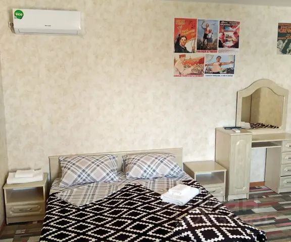 В номере одна большая двуспальная кровать с прочным матрасом и одна дополнительная односпальная кровать,большой шкаф для одежды, письменный стол, телевизор, холодильник, сплит-система. Своя душевая комната со всеми туалетными принадлежностями. Уборка номераи смена белья,один раз в неделю,замена полотенец каждые два дня.