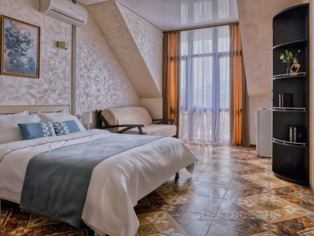 Люкс четырёхместный двухкомнатный площадью 28 кв.м с видом на горы. Подходит для размещения 4 человек. Имеет спальню с приятным интерьером. В номере: 1 двуспальная кровать, 2 односпальные кровати. Имеется: Балкон, антимоскитная сетка, телевизор, кондиционер, отопление, шкаф, вешалка, зеркало, журнальный столик, обеденный стол, стулья, холодильник, чайник. Индивидуальная ванная комната: душ, раковина, туалет. В стоимость входит: Постельное бельё, полотенца, мыло. WI-Fi бесплатно на всей территории. Бесплатная частная парковка за территорией.
