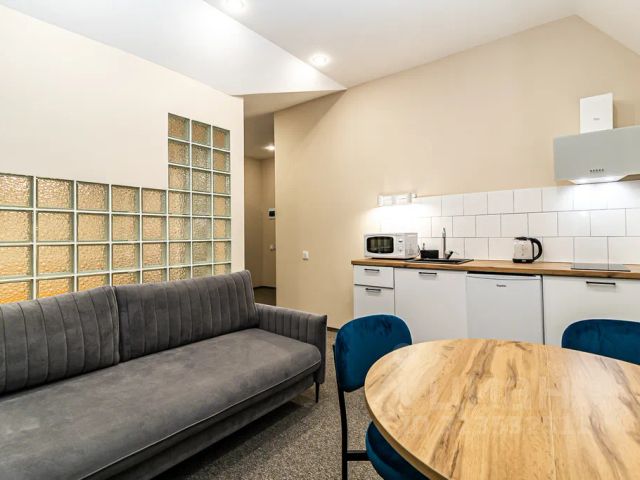 Однокомнатные апартаменты площадью 35 кв. М оснащены одной двуспальной кроватью размера "queen-size". В номере имеется оборудованная мини-кухня, необходимая посуда и рабочее место. Отель предоставляет постельное бельё премиум-класса и косметические средства. Фотографии, размещённые на сайте, носят исключительно информационный характер. Планировка, вид с балкона и размеры комнат могут отличаться от представленных на фотографиях в зависимости от конкретного номера.