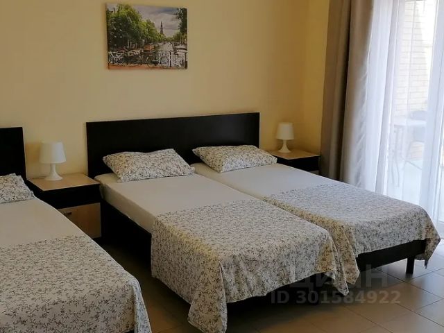 Комната 21 кв. м. на 3-м этаже с видом на бассейн. 2 односпальные кровати, 1 раскладывающийся двуспальный диван-кровать, телевизор, кондиционер, шкаф, прикроватная тумбочка, стол. Санузел (ванная, душ, унитаз, раковина), терраса 36 кв. м. и холодильник в коридоре - общие на две комнаты. Во дворе большой бассейн (работает с 15 мая), детская площадка, бесплатная парковка, видеонаблюдение.