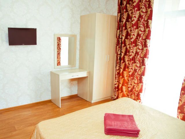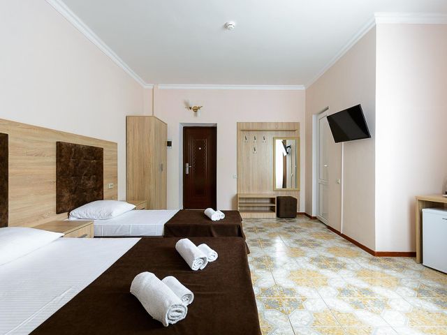 Отель "Альта Виста" - новый комфортабельный отель, расположен в городе Туапсе рядом с федеральной трассой М4, по которой можно доехать до Сочи. Из окон отеля открывается замечательный вид на Кавказские горы. В 5 минутах езды от отеля находится побережье Черного моря, немноголюдный пляж. Весь интерьер отеля "Альта Виста" выполнен в едином стиле, элегантное сочетание темного дерева и металла со стенами светлых тонов, воздушные занавеси сочетаются с темными портьерами. Весь интерьер дарит ощущение уюта и комфорта. В отеле 3 этажа и 19 номеров различных категорий. Все номера оборудованы: холодильником, ванной комнатой, кондиционером, телевизором. Для гостей отеля "Альта Виста" имеется бесплатная парковка, кафе с Европейской кухней, бар, автомойка для транспорта, продуктовый магазин, банкомат. К услугам гостей отеля: сауна с бассейном, зоной отдыха и массажным креслом, а так же бесплатный wi-fi. Отель "Альта Виста" идеально подходит для отдыха и деловых поездок. В отеле и окрестностях гости могут совершить пешие и велосипедные прогулки. В "Альта Виста" можно приехать с детьми или провести недельку в уединении и насладиться тишиной и природой. В номере: 1 двуспальная / 2 односпальные кровати, телевизор, рабочий стол, стул, кондиционер, шкаф, санузел.