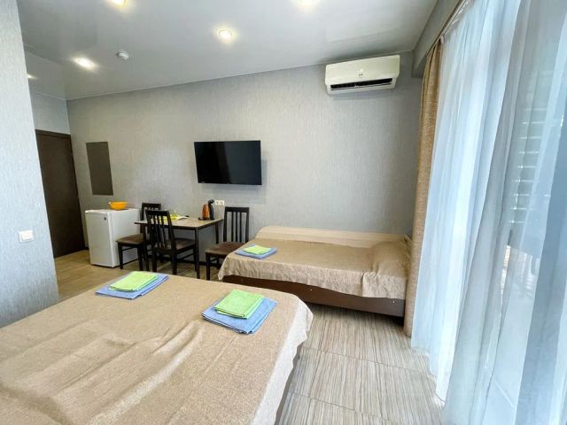 Удобное расположение гостевого дома-(центральная часть поселка до железной дороги), развитая инфраструктура, близость городского парка, центральной набережной. Выход к морю-5-7 мин на благоустроенный пляж "Лазаревское взморье" (не перегодить автомобильную и железную дорогу) 3-х мест номер "эконом" — в номере тв, кондиционер, холодильник, души и туалет на 3 комнаты. В номере три раздельные кровати. Номер находится на 2 этаже. Проводной интернет Есть общая кухня на террасе (2 этаж), столики. Так же столики и мангал (принадлежности для барбекю) во дворе.