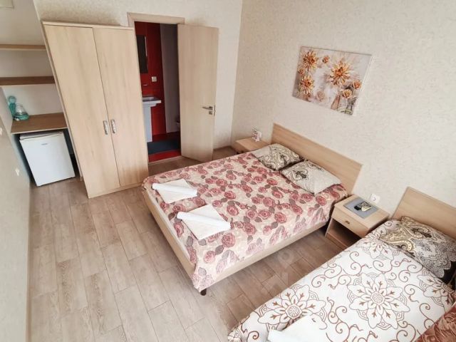 Территорий закрыта от посторонних, озеленение при входе, в номере мебель из натурального дерева, в номере чайник. Холодильник, т/в цифровое, сплит система, утюг и чайник на этаже, для курящих есть балкон на этаже, сушка для белья за окном, море 250 метров, центральный пляж, городской парк для детей