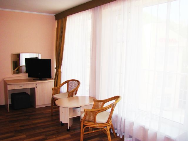 В номере мини холодильник,чайник,чашки,стаканы и стопочки,фен,сплит система,шкаф,тумбочки,стол,телевизор,гладильная доска,утюг. Двуспальная кровать ,диван-кровать шириной 1.3 м. и конечно же санузел. Выход на общий балкон,где есть столик,за которым можно спокойно посидеть в удобных креслах и полюбоваться на закат или за красивейшим панорамным видом на горы и инфраструктуру поселка. Обьекты новые ,с хорошим качественным ремонтом,с панорамными окнами в пол. В завершение интерьера -окна обрамлены в бархат и лен. д на пляж "радужный" бонусом , бесплатный вход на пляж "радужный"