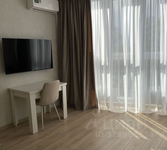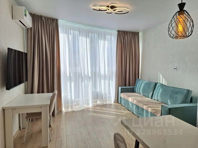 Квартира выполнена в светлых тонах, что создаёт атмосферу уюта и простора. В комнате и на кухне есть вся необходимая мебель, а также современная бытовая техника: кондиционер, холодильник, телевизор и стиральная машина .