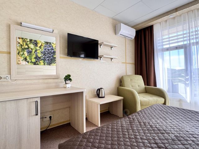 Номер увеличенной площади с современным интерьером, оснащен кухней и ванной комнатой. Кухня оборудована всем необходимым для приготовления пищи: посуда, плита, микроволновая печь, холодильник, электро чайник. В числе удобств — кондиционер, телевизор с плоским экраном, интернет в каждом номере, обеденная зона, шкаф-купе для одежды, сушилка для белья. В распоряжении гостей собственная ванная комната с душевой, полотенцами и туалетно-косметическими принадлежностями. Спальные места укомплектованы ортопедическими матрасами. В случае необходимости гостям может быть предоставлены фен, утюг и гладильная доска. Услуга стирки предоставляется за дополнительную плату.