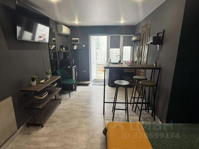 Студия 15 кв. м Комфортная студия площадью 15 кв. м идеально подойдёт для размещения двух взрослых и ребёнка до 11 лет. * Спальные места: двуспальная кровать и кресло-кровать (дополнительное место для третьего гостя). * Оснащение: * стиральная машина; * сплит-система * телевизор; * Wi-Fi; * кухонный гарнитур * санузел. Расположение: в сердце города-курорта. Вас ждёт всё в пешей доступности: * живописный парк; * благоустроенная набережная; * разнообразные кафе и рестораны; * пляжи — всего в нескольких минутах ходьбы.