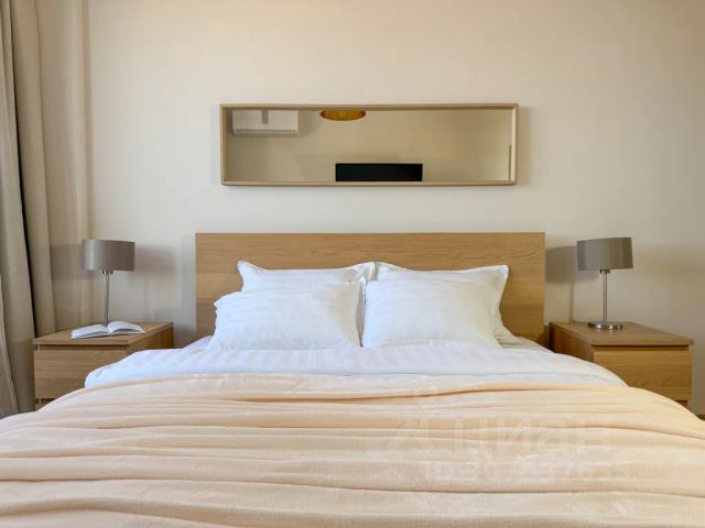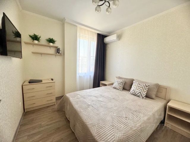 Спальная комната площадью 20м2, с панорамным окном с видом на море. Комната имеет следующее оснащение: двуспальная кровать на 2 чел. (ширина 160см), раскладной диван на 2 чел. (шириной 160см.), прикроватная тумбочка, журнальный столик, шкаф для одежды с полочками и вешалками, утюгс гладильной доской, фен, сушилка для белья, ЖК телевизор со спутниковыми каналами, сплит-система и теплым пол.