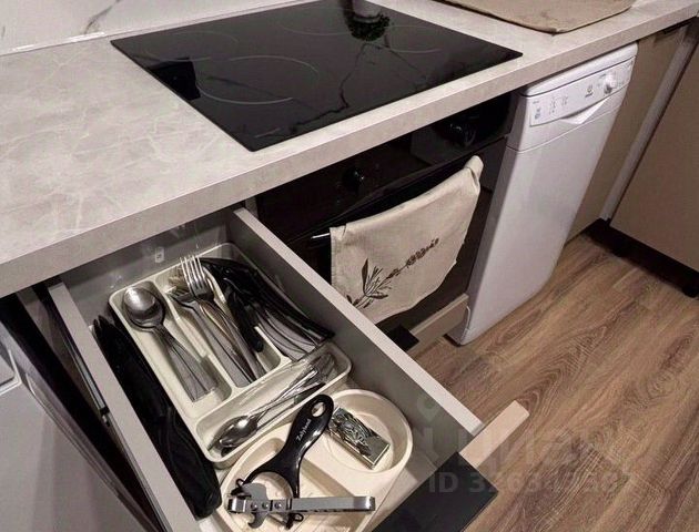 Кухонная зона имеет все необходимое: барная стойка, два полубарных стула, холодильник, стиральная машина indesit, микроволновая печь, чайник, газовая панель на 4 конфорки, вытяжка, столовые приборы и посуда.