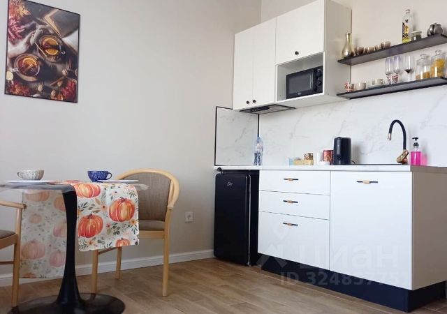 Кухонная зона имеет все необходимое: барная стойка, два полубарных стула, холодильник, стиральная машина indesit, микроволновая печь, чайник, газовая панель на 4 конфорки, вытяжка, столовые приборы и посуда.